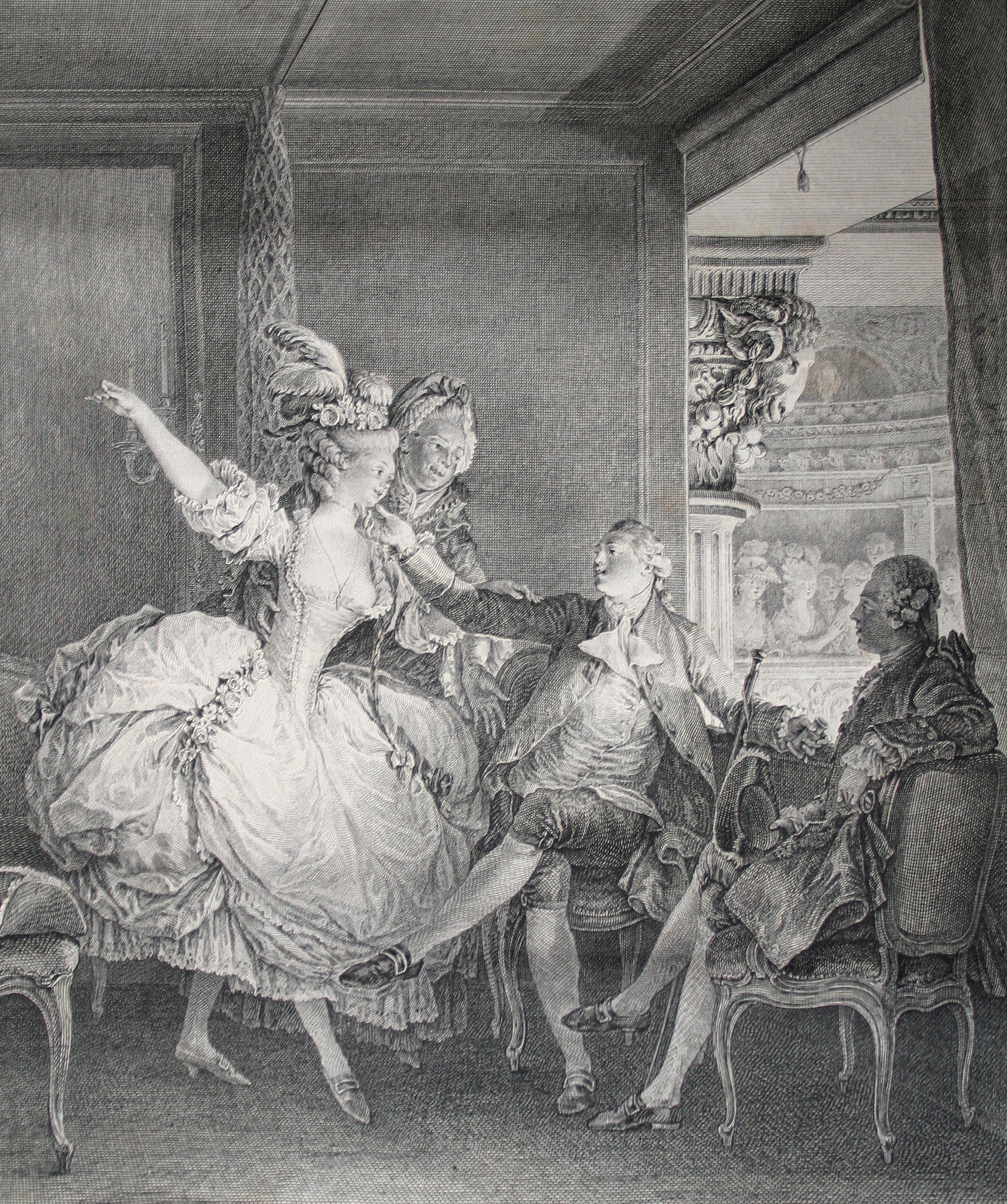 Image of Eighteenth Century French Costume: La Petite Loge. Drawn by Jean Michel Moreau for his Restif de La Bretonne. The original copy of this image can be found at the Roderic Bowen Library and Archives, University of Wales Lampeter.