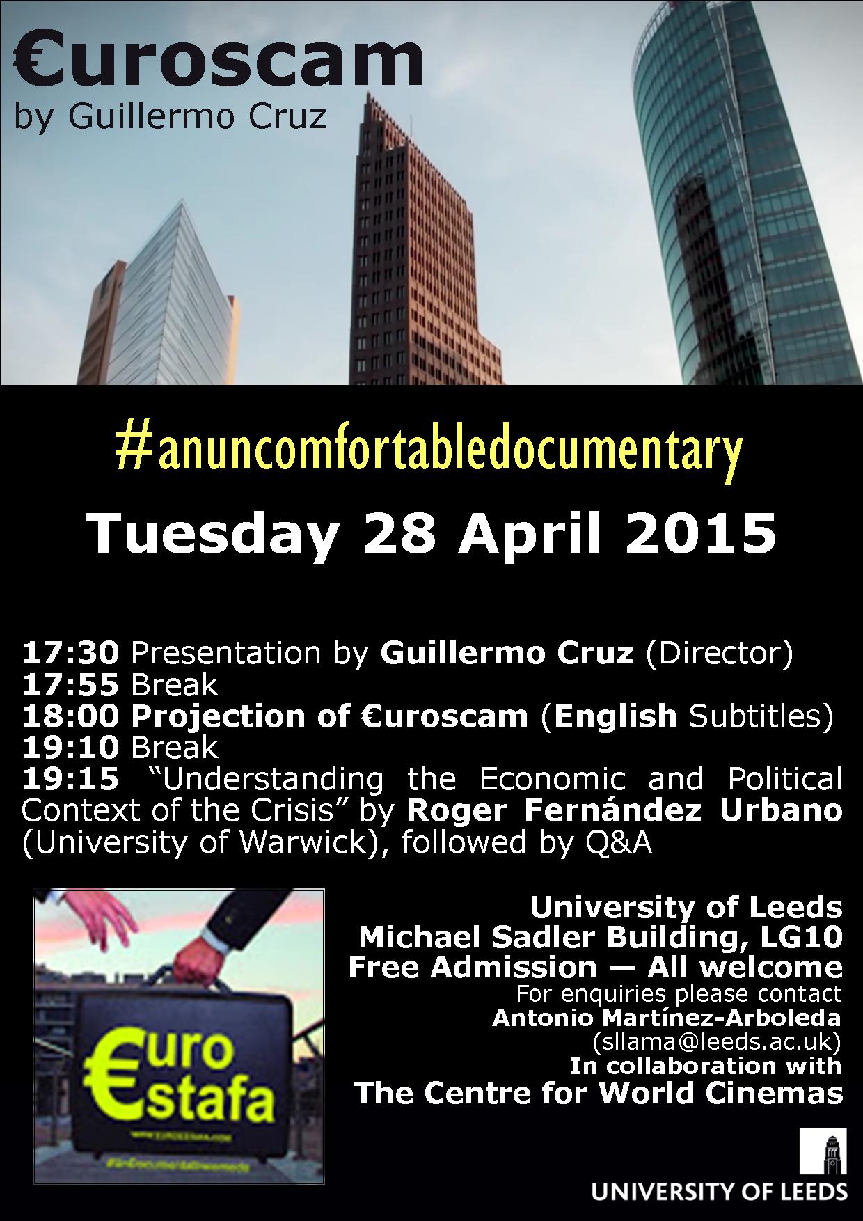 €uroscam, #anuncomfortabledocumentary. This is the presentation given by Guillermo Cruz at the University of Leeds on the 28 April 2015, during the premiere of his film €uroestafa in the UK. It is in Spanish with consecutive translation into English. The interpreter and organiser of the event is Antonio Martínez-Arboleda, Principal Teaching Fellow in Spanish in the School of Languages, Cultures and Societies of the University of Leeds. This resource contains poster of the event, link to the mymedia video presentation and link to the Prezi presentation. With thanks to funding for the production of Open Educational resources from the HumBox project. The event was also supported by The Centre for World Cinemas of the University of Leeds. Creative Commons Licence 3.0 BY-NC-SA. Copyright University of Leeds. 2015