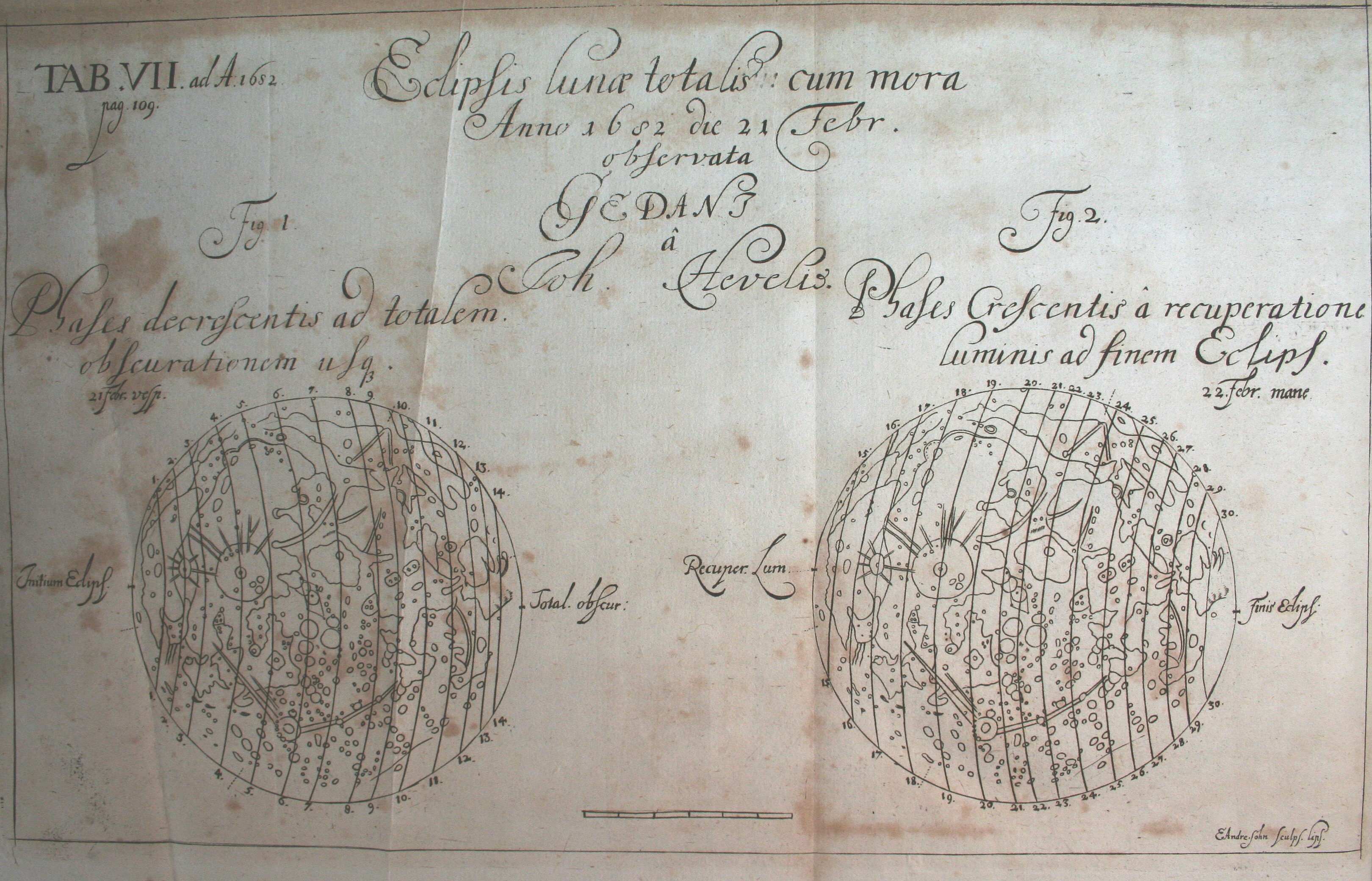 A diagram of the lunar eclipse which appeared in the Acta Eruditorum scientific journal in 1682. The original copy of this image can be found at the Roderic Bowen Library and Archives, University of Wales Lampeter.