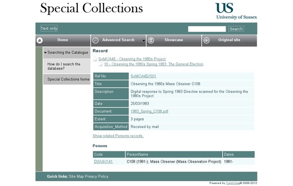 Listed here are links to the directive questionnaire and to entries in the University of Sussex Special Collections catalogue where users can click on additional links to a PDF of the individual's response to the directive, and to more information about them. There are ten responses to the 1983 Spring directive covering The General Election, Waterworkers' Strike, Coinage, Viewing and Reading.