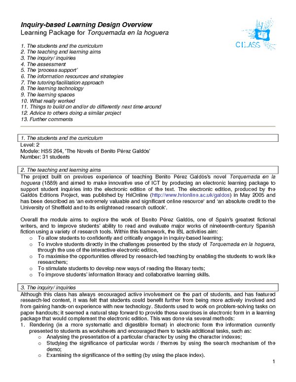 This IBL was created for the Modern Languages Department to enhance student learning and study of Torquemada en la Hoguera. This resource was produced with the help of CILASS (Centre for Inquiry-based Learning in the Arts and Social Sciences) at the University of Sheffield (see http://www.shef.ac.uk/cilass).