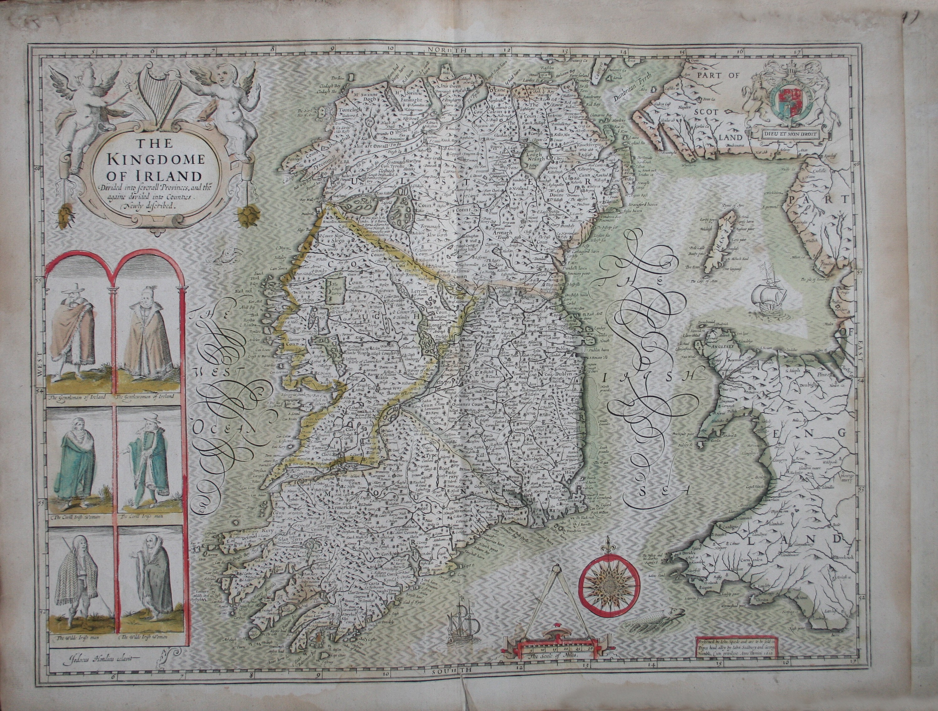 Map of the Kingdom of Ireland drawn by the English historian and cartographer John Speed in 1610. The map was used for description and travel. The original copy of this image can be found at the Roderic Bowen Library and Archives, University of Wales Lampeter.