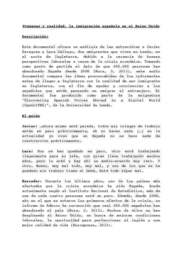 carencia de buenas perspectivas laborales a causa de la crisis económica. Tomando como punto de partida el dato de que 400.000 personas han abandonado España desde 2008 (Mora, J, 2013), este audio documental compara las ideas preconcebidas de los informantes antes de llegar a Inglaterra con la realidad de ser inmigrante en Inglaterra, con el fin de ayudar y concienciar a los españoles que