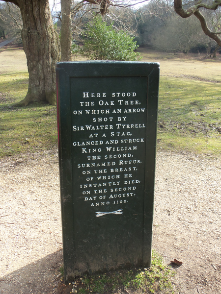Memorial to William II of England at Rufus Stone, Hampshire. The stone is the near to the spot where he was believed to have been killed while out hunting in 1100. The Sir Walter Tyrell pub is also pictured.